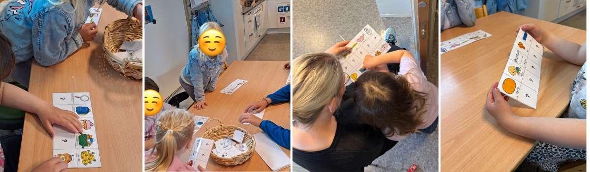 Birgitte forteller også om hvordan barnehagen jobbet med logiske par: Bildene viser barn i aktivitet med oppgavebrett som trener logisk tenking, matching og språk. Vi har brukt disse brettene i både smågrupper og som del av språkstimulerende lek, der barna sammen med voksne samarbeider for å finne logiske par. Denne tilnærmingen har gitt barna muligheten til å utforske mønster, likheter og ulikheter på en konkret og hands-on måte.
