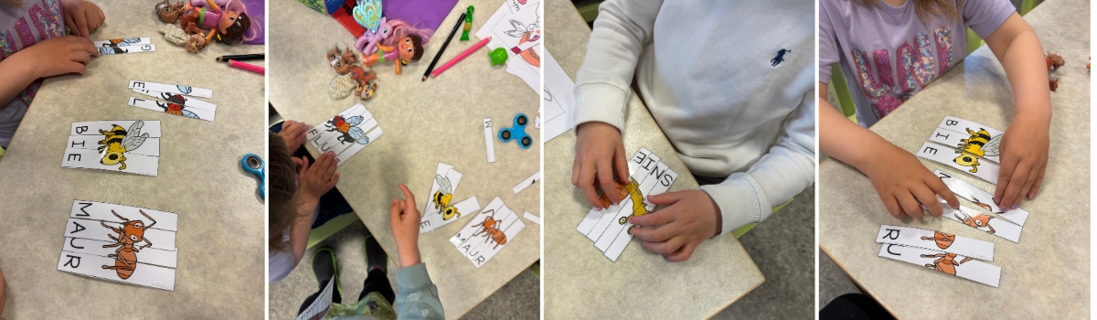 Bildene over viser sorteringspuslespill om insekt. Birgitte forteller at barna har mestret å sortere insekt, både med og uten bokstavkompetanse. Bildene er klare og tydelige, og det er enkelt for dem å sette dem sammen i riktig rekkefølge.