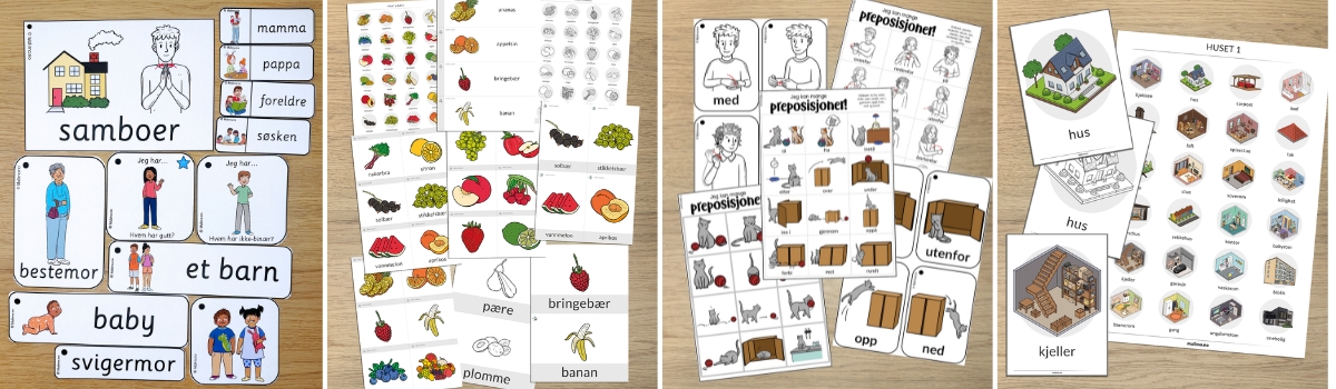 - Ord- og bildekort Type A (første bilde over): I disse settene har man ordkort med bare ordet, ord og bilde sammen, bare bilde, fotokort på mange emner, samt ulike aktiviteter som lesedomino, loop-spill mm. Ordene fås med og uten artikler, og det følger med egenillustrerte tegnspråk / TTT-kort. Materiellet er på bokmål, nynorsk og engelsk, og åpner opp for fine tverrfaglige aktiviteter, både i norsk og engelsk, men også andre relevante fag ut i fra emne. Vi lager både egne illustrasjoner for ordene, samt tegnspråk-illustrasjonene, så dette materiellet er helt unik og kun tilgjengelig via Malimo.no. 🙂